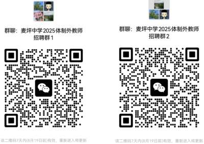1.凡符合條件的有意者,請(qǐng)掃描下方二維碼進(jìn)入“麥坪中學(xué)2025體制外教師招聘群1”(先進(jìn)群1,如果群1滿了,再進(jìn)“麥坪中學(xué)2025體制外教師招聘群2”,兩個(gè)群都一樣,請(qǐng)不要同時(shí)進(jìn)兩個(gè)群)。